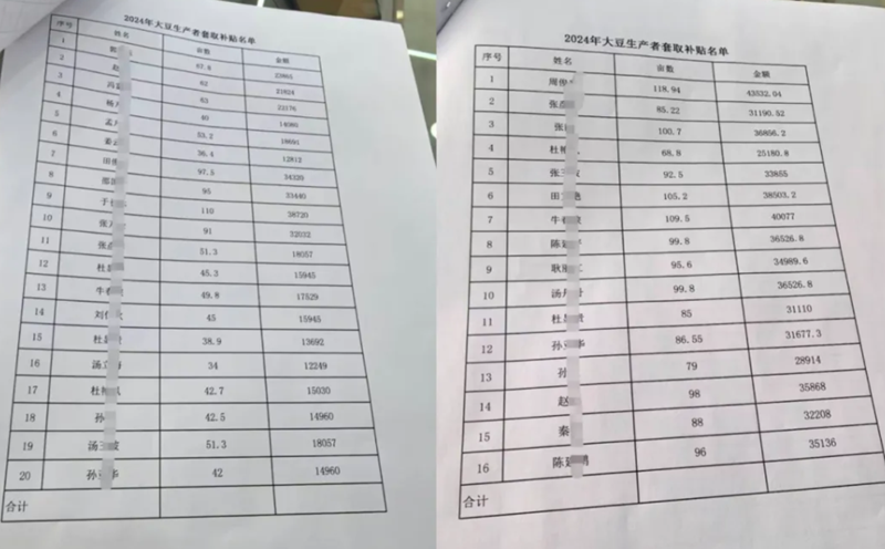 于军向媒体提供了多名村民的补贴异常情况,金额明确。例如,2023年,宽三村瓦盆窑屯张某萍获85.22亩大豆补贴31190.52元、张某获100.7亩大豆补贴36856.2元。2024年,村民汤某梅已将土地卖给他人种植玉米,却仍能获得34亩地大豆补贴12249元;同样,常年在外打工、土地卖给他人种植玉米的村民孙某、孙某华等,名下仍获得数万元大豆补贴。