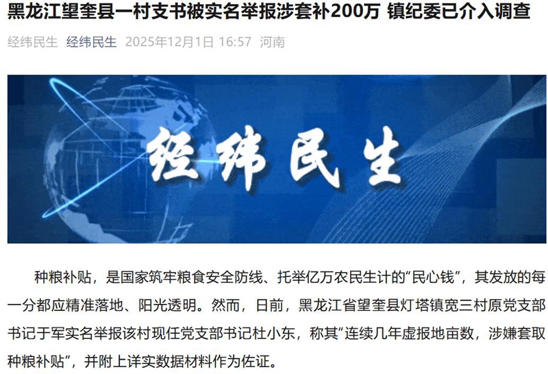 种粮补贴,是国家筑牢粮食安全防线、托举亿万农民生计的“民心钱”,其发放的每一分都应精准落地、阳光透明。然而,日前,黑龙江省望奎县灯塔镇宽三村原党支部书记于军实名举报该村现任党支部书记杜小东,称其“连续几年虚报地亩数,涉嫌套取种粮补贴”,并附上详实数据材料作为佐证。