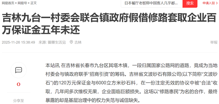 本站讯 在吉林省长春市九台区其塔木镇,一段归属国家公路网的道路,竟成为当地村委会与镇政府联手“招商引资”的筹码。吉林省文波砂石有限公司(以下简称“文波砂石”)的120万元保证金与6000立方米砂石料,在一份注定无效的协议中被“合法”收取,几年间多次维权无果,企业面临巨额损失。这场以“修路惠民”为名的合作,最终暴露的却是基层治理中的权力失范与诚信缺失。