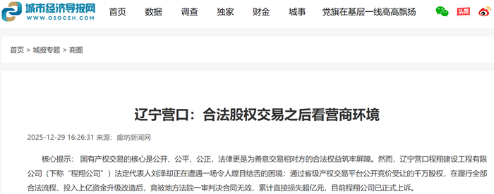 核心提示: 国有产权交易的核心是公开、公平、公正,法律更是为善意交易相对方的合法权益筑牢屏障。然而,辽宁营口程翔建设工程有限公司(下称“程翔公司”)法定代表人刘泽却正在遭遇一场令人瞠目结舌的困境:通过省级产权交易平台公开竞价受让的千万股权,在履行全部合法流程、投入上亿资金升级改造后,竟被地方法院一审判决合同无效,累计直接损失超亿元,目前程翔公司已正式上诉。