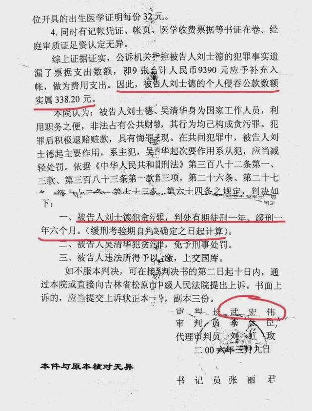 2006年3月,吉林省扶余县人民法院认定刘世德侵占公款338.20元,判处有期徒刑一年,缓刑一年半。