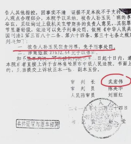 2016年,经扶余市(2013年扶余县撤县设市)人民法院审理,认定孙玉民等人贪污公共卫生专项资金4.6万元,其中孙玉民分得2.7万元。但给予其免予刑事处罚。