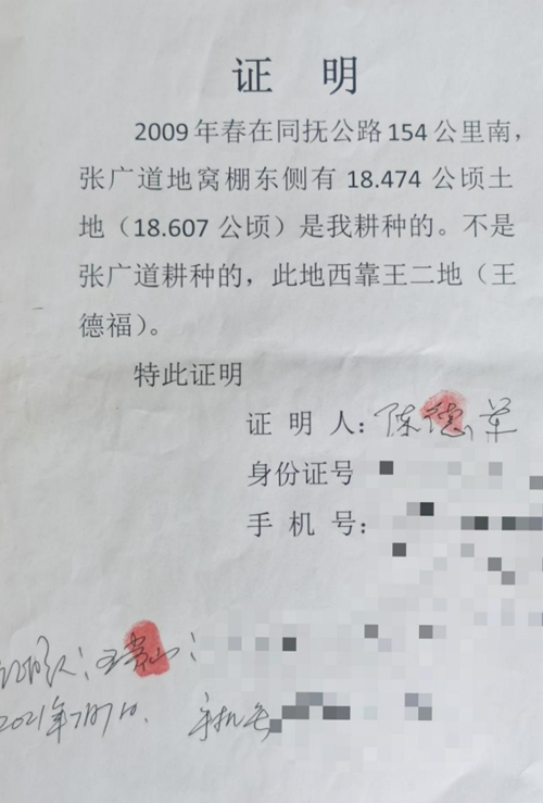 2021年7月7日,陈德军,王贵山亲笔为张广道写下证明:“2009年春在同抚公路154公里南,张广道地窝棚东侧有18.607公顷地(18.474公顷)是我耕种的,不是张广道耕种的,此地西靠王二地(王德福)特此证明”。陈德军、王贵山在证明书上签字,并留下身份证号码和联系电话。