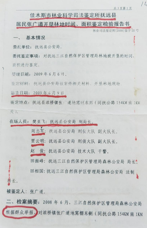 《佳木斯市林业科学司法鉴定所鉴定抚远县居民张广道开垦林地时间、面积鉴定检验报告书》