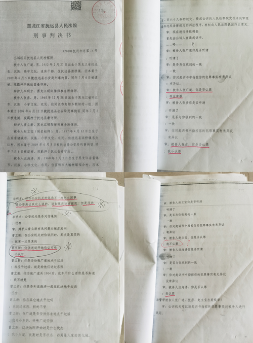 张广道告诉记者:“我是2009年6月5日早上在自家地窝棚前被三江自然保护区公安局田振峰、保护站长李红军抓走的,他们把我带上警车,直接送到三江保护区进行关押,一整天也没有对我进行询问。大约晚上6点左右,突然来了一个人,他自称是抚远县公安局的张凯,在没有核实我的身份、不询问、不录口供、不做笔录的情况下,告诉我被刑拘了,同时拿出刑事拘留通知书让我签字。我说,我犯什么法了,我不签字。办案人员不容分说把我送进了抚远县看守所。抚远县公安局从6月5日对我刑拘,到抚远县检察院7月6日对我批捕,公安局在一个月的时间里对我进行过5次提审,奇怪的是公安局从未带我对作案现场进行指认,我也没有在涉案地块损坏林地,我耕种的土地是合法的,所以我不承认自己犯非法占用农用地罪。这是保护区李红军、保护区公安局田振峰等人精心策划的一起冤案。我们四人涉案,三人当庭翻供,张彦还当庭陈述抚远县公安局办案人员骗供、诱供,让他按公安局的意思供诉,骗他说可以放他回家。”