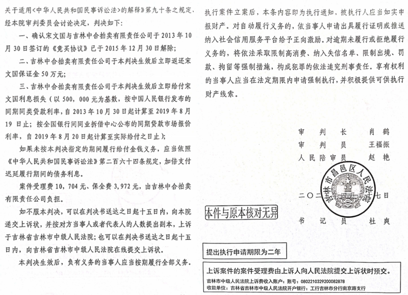 其二,审限严重超期,“内部请示”沦为程序违法挡箭牌。根据《民事诉讼法》规定,普通民事案件一审审限最长不超过9个月,但本案一审审限长达一年多。中合拍卖就此质疑时,法院竟以“需向中院请示、中院人员变动导致暂缓”为由搪塞。而吉林市中级法院在审理中,未对一审超期审理的程序违法问题予以纠正,反而维持了存在程序瑕疵的一审判决,违背了“程序正义是实体公正前提”的司法原则。中合拍卖因此认为,一审与二审其实是早就串通好了的,涉嫌程序违法。