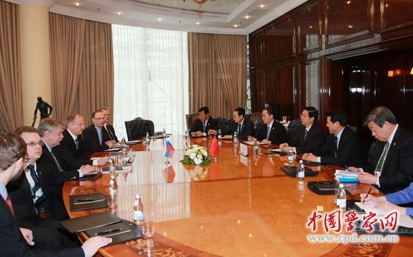 图为国务委员郭声琨与俄罗斯联邦警卫总局局长穆罗夫举行会谈。 人民公安报中国警察网记者 张建鑫 摄