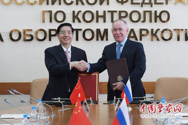 图为国务委员郭声琨与俄罗斯联邦麻醉品监管总局局长伊万诺夫举行会谈并签署部门间合作协议。人民公安报中国警察网记者 张建鑫 摄