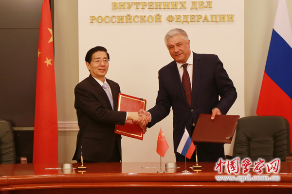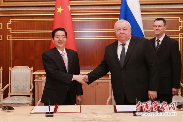 图为国务委员郭声琨与俄罗斯联邦内务部部长科洛科利采夫举行会谈并签署部门间合作协议。人民公安报中国警察网记者 张建鑫 摄 |