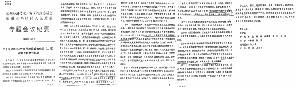 更为严重的是,举报材料详细披露了三起涉嫌恶意转移国有资产的关键事件:2020年4月,在岐瑞公司无力支付1.4亿元土地出让金尾款的情况下,林建豪以区政府名义下发文件,要求区土地发展中心以安商房回购款名义,将7700万元财政资金转给该公司,用于支付部分土地出让金,而此时该项目不仅未交齐土地出让金,未签订回购协议,甚至未达到合同约定的建设进度要求,且土地发展中心分管领导曾明确反对该违规付款行为;2020年8月,林建豪无视区国房中心相关禁令,逼迫马尾区不动产中心出具证明,帮助岐瑞公司以项目土地及房屋为抵押物获得1.5亿元银行贷款,后续又通过区政府会议纪要要求土地发展中心垫付1亿元为该公司解押;2023年8月,林建豪主持专题会议并形成政府纪要,将项目停工归咎于区政府未拨付资金,导致区土地发展中心在与岐瑞公司的商事仲裁中败诉,需支付利息和罚息7900多万元,且损失仍在持续扩大。