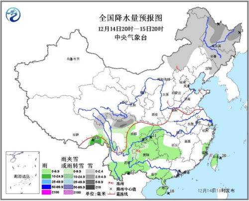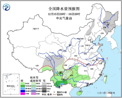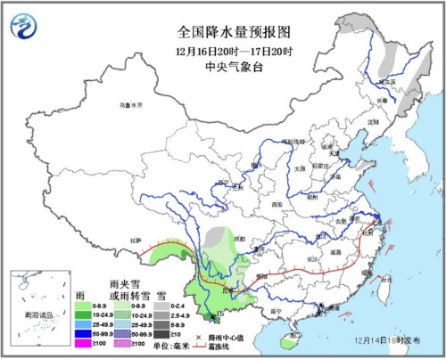 受南支槽和静止锋影响,14至16日,西南地区东部等地有小到中雨或雨夹雪,其中15日云南南部局地有大雨。
